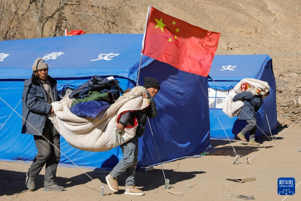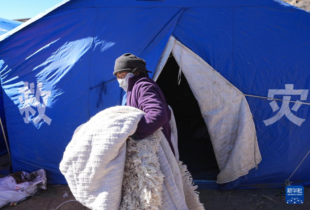 1月10日,在定日縣長所鄉(xiāng)古榮村,受災(zāi)群眾準(zhǔn)備將個人物品從臨時安置帳篷搬入板房。新華社記者 沈伯韓 攝