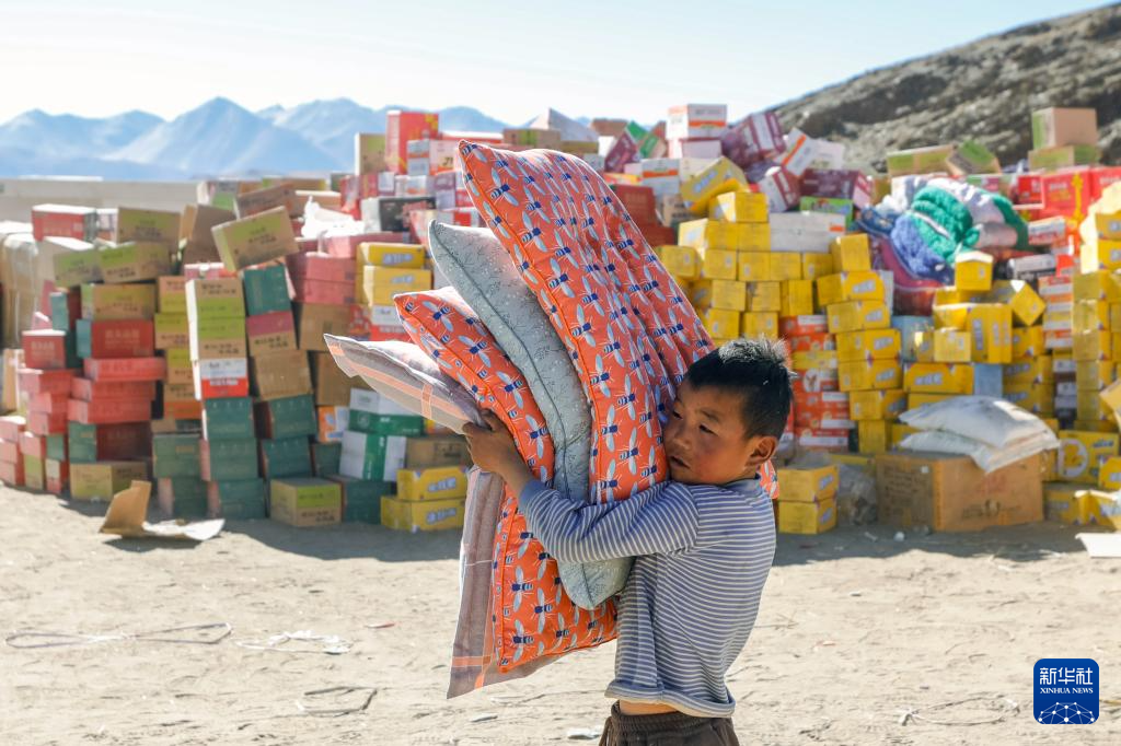 1月10日,在定日縣長所鄉(xiāng)古榮村,一名男孩抱著領(lǐng)取到的過冬物資,從臨時安置帳篷搬入板房。新華社記者 沈伯韓 攝