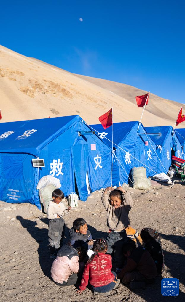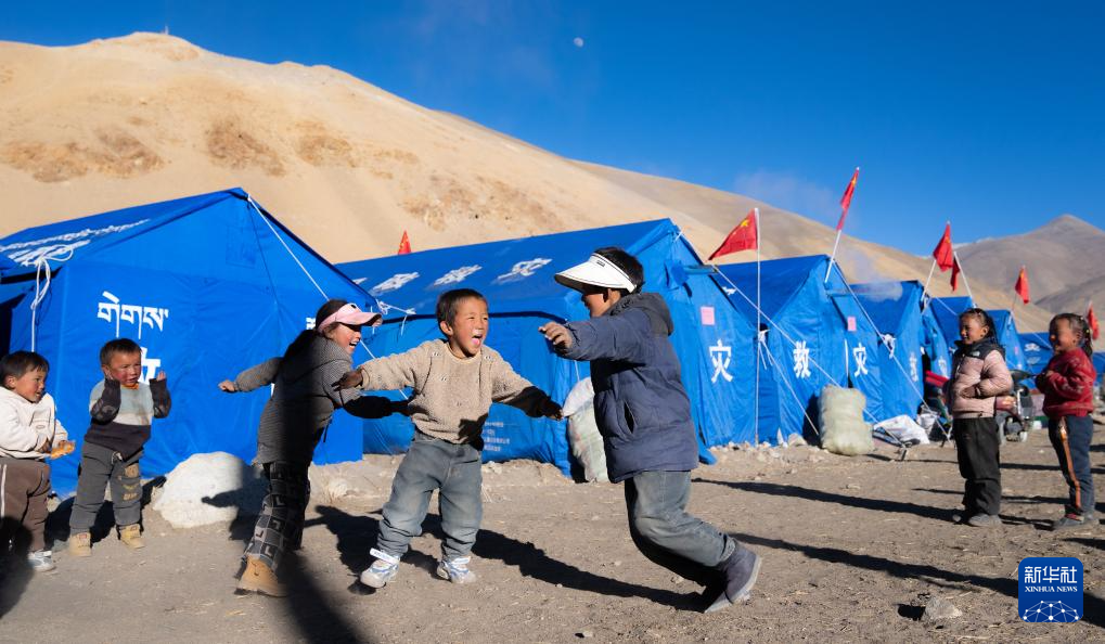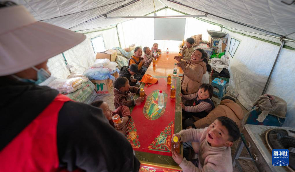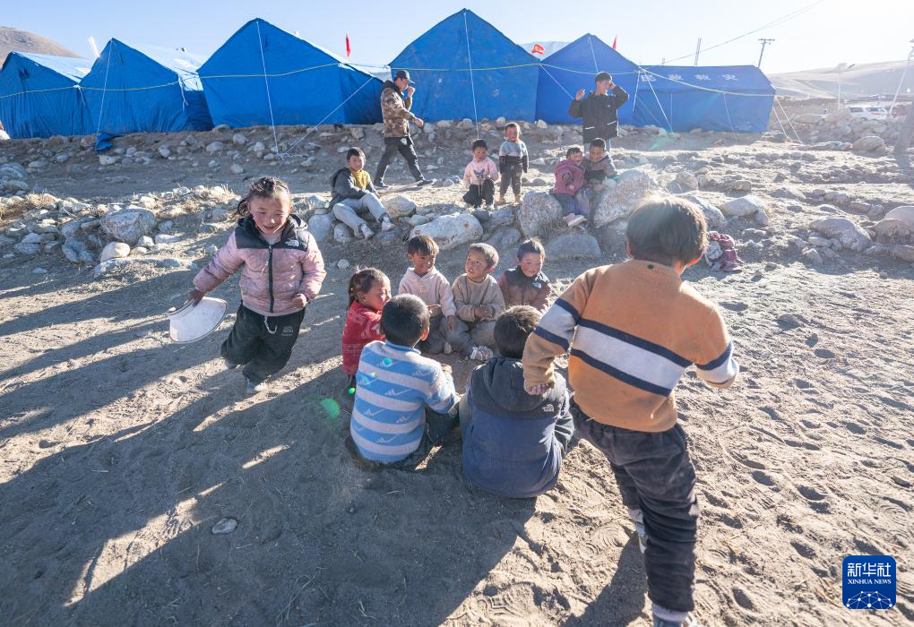 1月10日,在定結(jié)縣郭加鄉(xiāng)乃村安置點,孩子們在學生臨時學習區(qū)做游戲。新華社記者 丁增尼達 攝