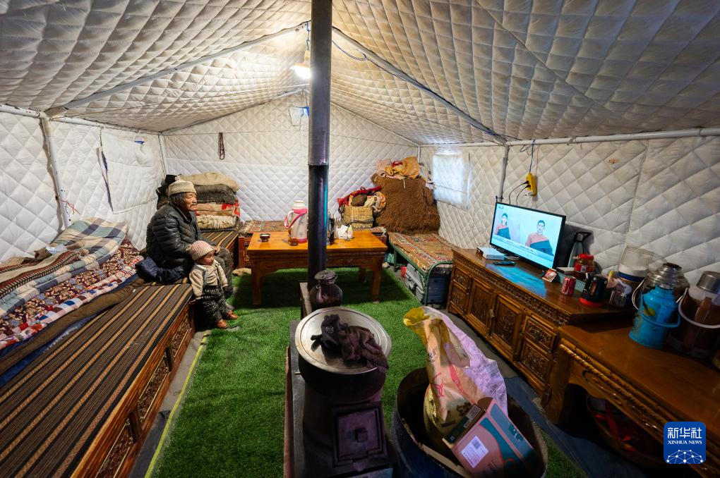 1月10日,在定結(jié)縣郭加鄉(xiāng)乃村安置點,老人和孩子在救災(zāi)帳篷里看電視。新華社記者 丁增尼達 攝