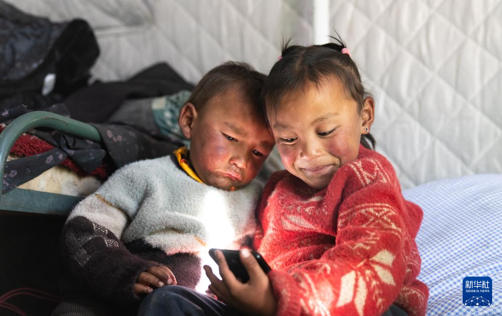 1月10日,在定結(jié)縣郭加鄉(xiāng)切村安置點,姐弟倆在帳篷里依偎著玩手機。新華社記者 丁增尼達 攝