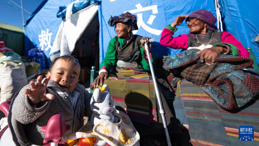 1月10日,在定結(jié)縣郭加鄉(xiāng)切村安置點,老人和孩子在救災(zāi)帳篷前休息、曬太陽。新華社記者 丁增尼達 攝
