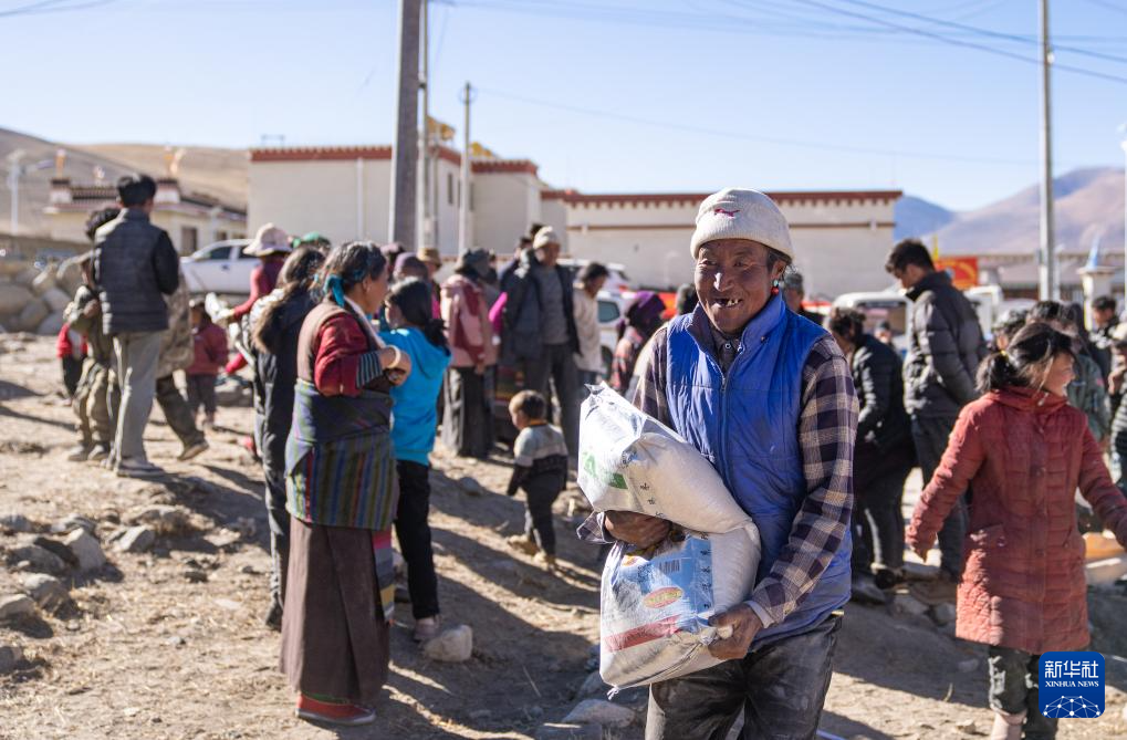 1月10日,在定結(jié)縣郭加鄉(xiāng)切村安置點,領(lǐng)到大米的老人露出笑容。新華社記者 丁增尼達 攝