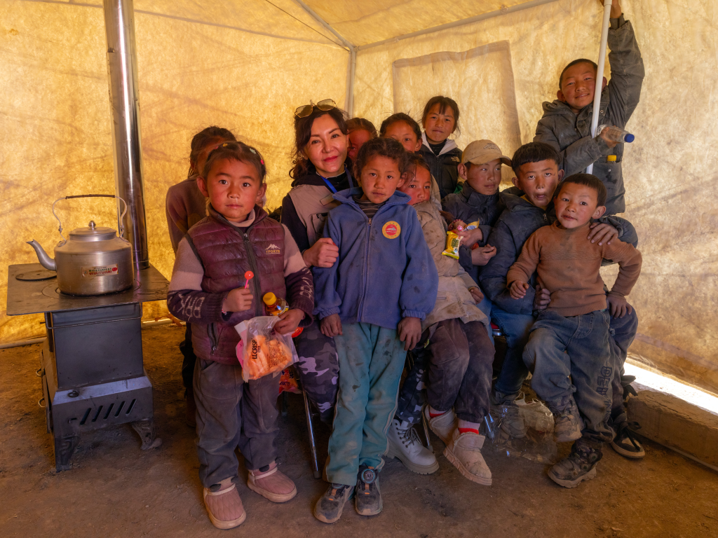 12日上午,西藏定日縣曲洛鄉(xiāng)措昂村的集中安置點里,一群小姑娘圍著一名大姐姐,歡呼雀躍。她們從大姐姐的手里接過顏料筆、畫紙、糖果等禮物,咧嘴笑了起來。