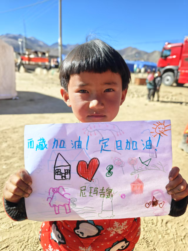 6歲的尼瑪吉宗穿著花棉襖,先畫了一頂小小的帳篷,在旁邊畫上了大大的紅心,把梳著羊角辮的自己也畫上去,天空畫上了太陽。她想了想,工工整整地寫上:“西藏加油!”“定日加油!”