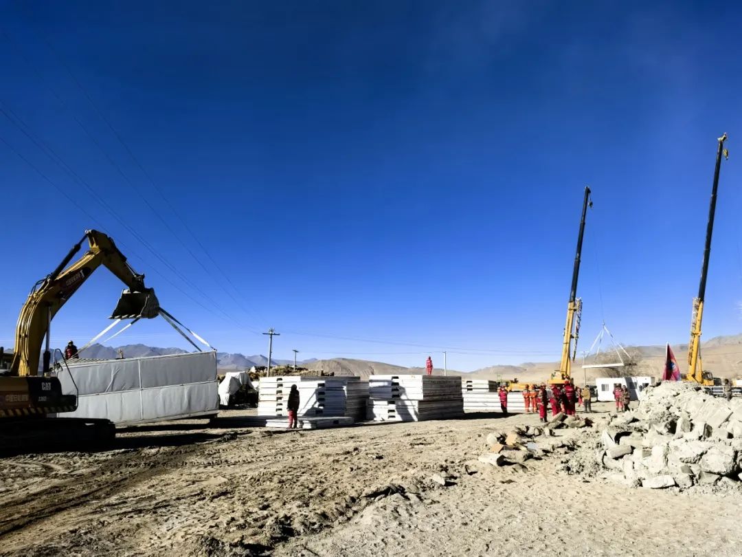 圖為在日喀則市定日縣長(zhǎng)所鄉(xiāng)玉白村安置點(diǎn),工作人員正在吊裝板房。平措塔杰 攝