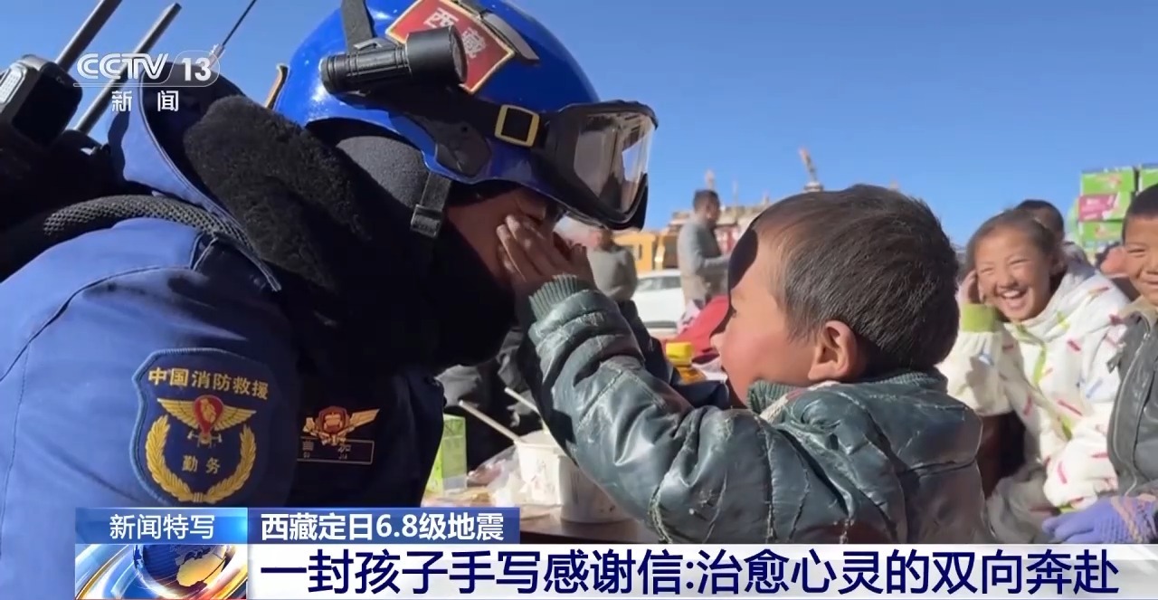 西藏森林消防總隊(duì)教育宣傳處助理員 鄭龍:能感覺(jué)到孩子在地震里受到的驚嚇正在慢慢減少,還會(huì)主動(dòng)過(guò)去找消防員玩,主動(dòng)“受領(lǐng)任務(wù)”,幫忙搬運(yùn)物資。