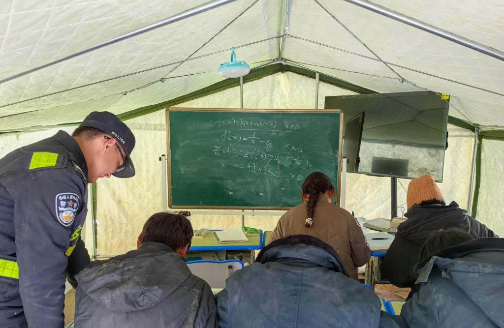 在西藏日喀則市定日縣長所鄉(xiāng)嘎布村安置點的帳篷內(nèi),民警劉鑫磊一手指了指黑板上的題目,一手拿著資料,耐心地給高三學(xué)生講解。5名學(xué)生坐在課桌前,低著頭,快速地在草稿紙上演算著。