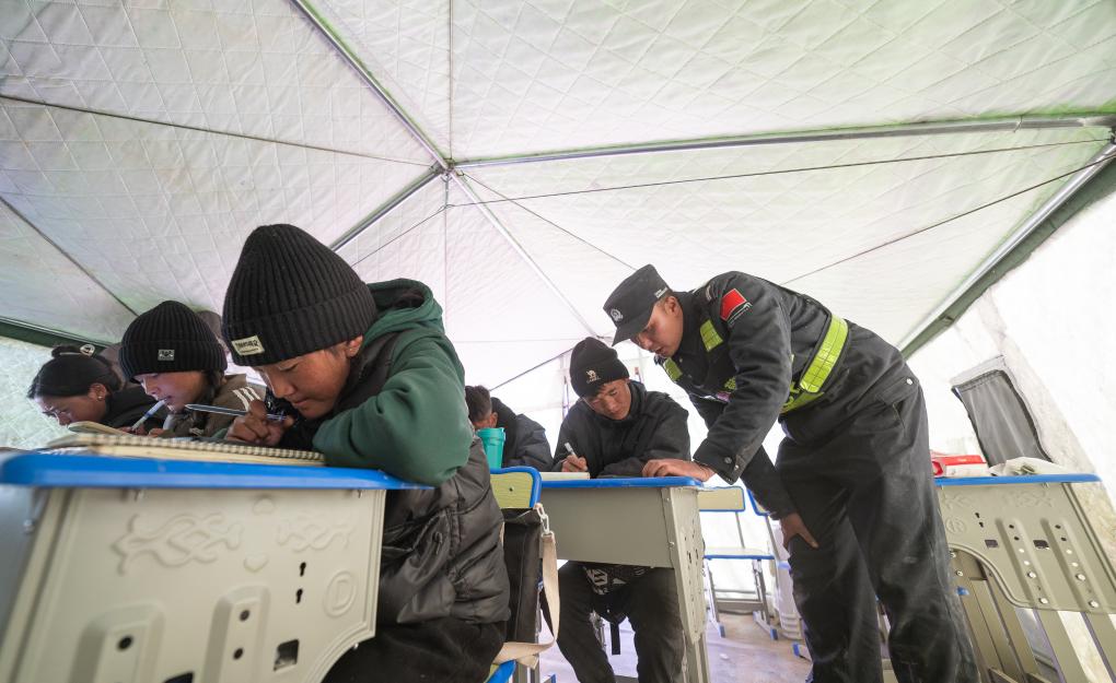 今年22歲的劉鑫磊,是西藏邊檢總站日喀則邊境管理支隊的一名新警。地震發(fā)生后,他和同事第一時間趕赴災(zāi)區(qū)救援。在救援工作進入過渡期安置階段后,他們排查發(fā)現(xiàn),雜村、嘎布村和玉白村共有6名高三學(xué)生、8名初三學(xué)生。這些學(xué)生正處于備考關(guān)鍵期,而地震讓附近的幾個村子遭受重創(chuàng),房屋倒塌,孩子們的課本和練習(xí)冊幾乎全部被毀。面對接連不斷的余震和考試的壓力,這些學(xué)生需要的不只是生活上的幫助。