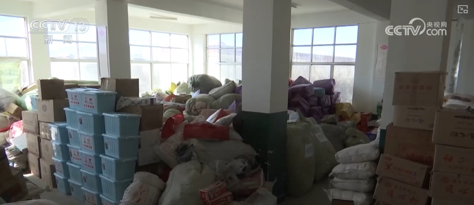 村民們居住的板房面積有限,也不能存放太多的物資,所有的物資都集中在村里的一個小學(xué)里,非常充足。