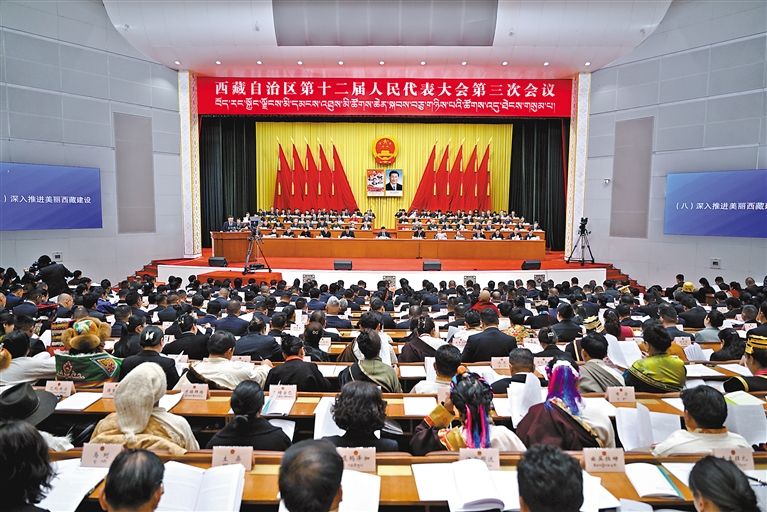 自治區(qū)十二屆人大三次會(huì)議開(kāi)幕會(huì)現(xiàn)場(chǎng)。記者 旦增西旦 攝