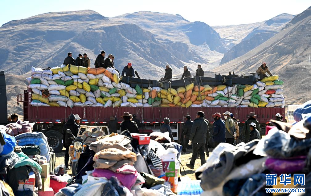 1月10日,在定日縣民族團(tuán)結(jié)廣場,人們搬運(yùn)將要運(yùn)往受災(zāi)群眾安置點(diǎn)的過冬物資。新華社記者 沈伯韓 攝