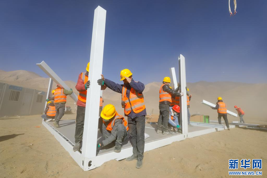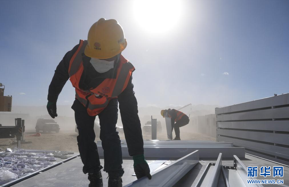 1月9日,中鐵二十局施工人員頂著風(fēng)沙在長所鄉(xiāng)森嘎村安裝活動(dòng)板房 。新華社記者 晉美多吉 攝