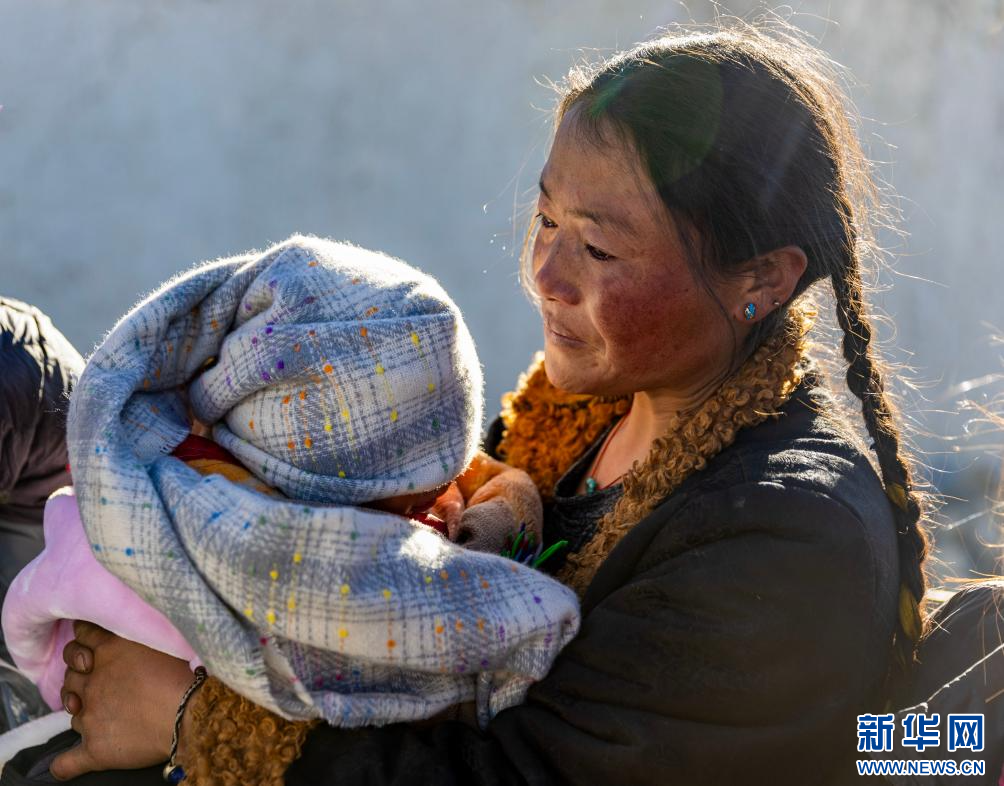 1月8日,定日縣長所鄉(xiāng)通來村的受災(zāi)群眾措姆抱著自己的孩子在領(lǐng)取志愿者送來的御寒衣物。新華社記者 姜帆 攝