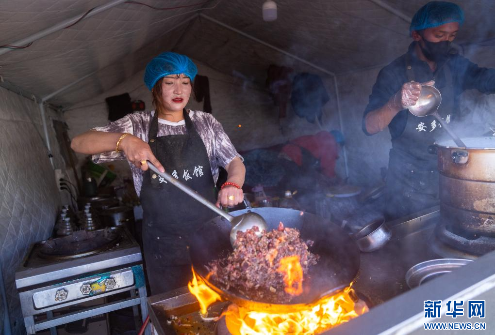 在定日縣長所鄉(xiāng)古榮村,定日縣安多飯館的吉瓊在為安置點(diǎn)的群眾做晚飯(1月15日攝)。新華社記者 丁增尼達(dá) 攝
