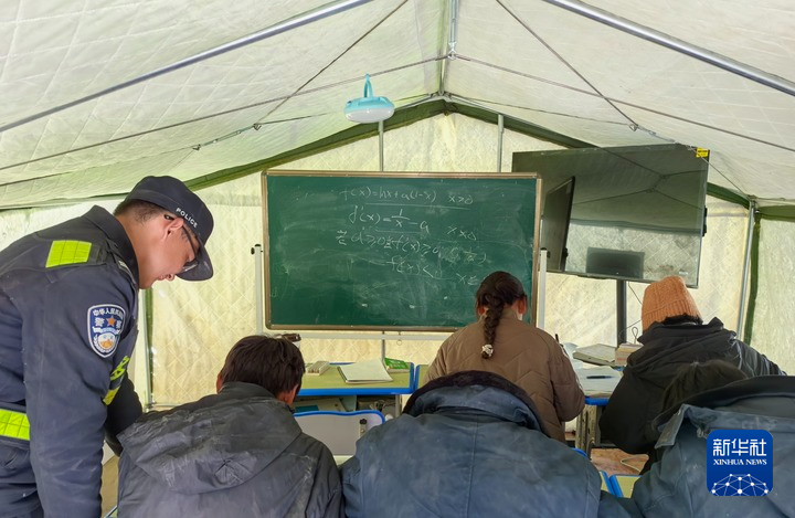 “大家看一下這道題怎么解?”在西藏日喀則市定日縣長所鄉(xiāng)嘎布村安置點的帳篷內(nèi),22歲的劉鑫磊一手指著黑板上的題目,一手拿著資料,耐心地給村里的高三學生講解。