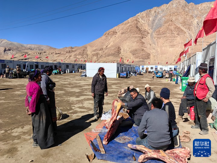 在定日縣曲洛鄉(xiāng)熱木青村安置點,村民們正在分發(fā)牛羊肉(1月14日攝)。新華社記者 林建楊 攝