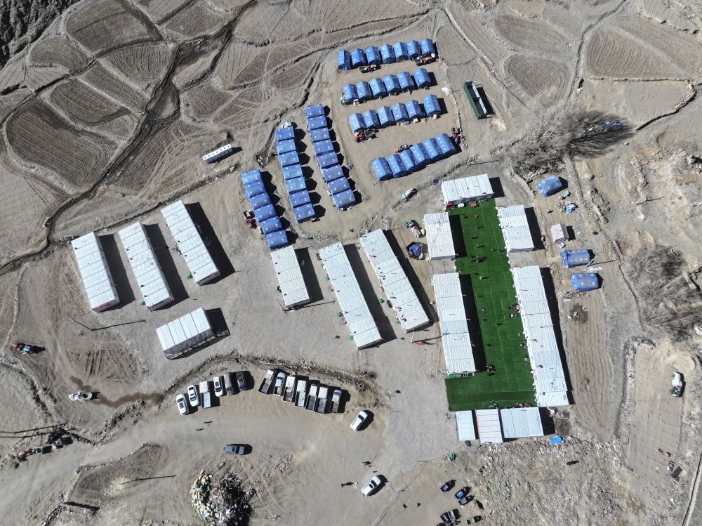 1月28日,定日縣長(zhǎng)所鄉(xiāng)古榮村安置點(diǎn),所有受災(zāi)群眾已搬入板房(無人機(jī)照片)。新華社記者 洛卓嘉措 攝
