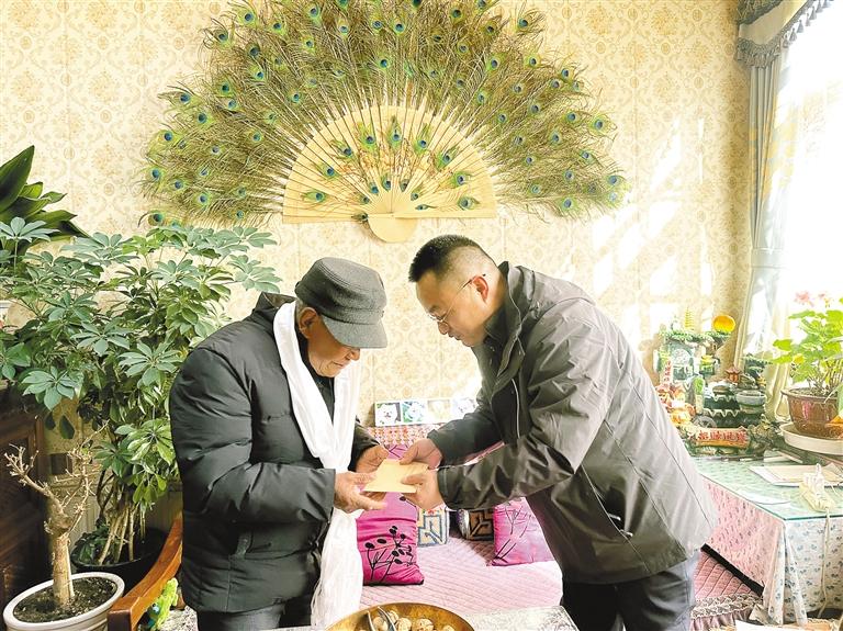 圖為拉薩市人民政府辦公室相關(guān)負(fù)責(zé)人為離退休干部職工敬獻(xiàn)哈達(dá)并送上慰問金。記者 劉琳琳 攝