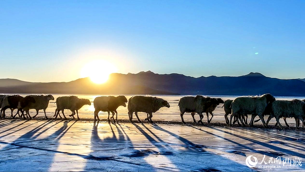 隨著一聲號(hào)令,牧民們驅(qū)趕著羊群,踏上冰封的湖面。遠(yuǎn)遠(yuǎn)望去,羊群如同一串串黑白相間的珍珠,在湛藍(lán)的冰面上緩緩移動(dòng),構(gòu)成一幅壯美的高原畫卷。