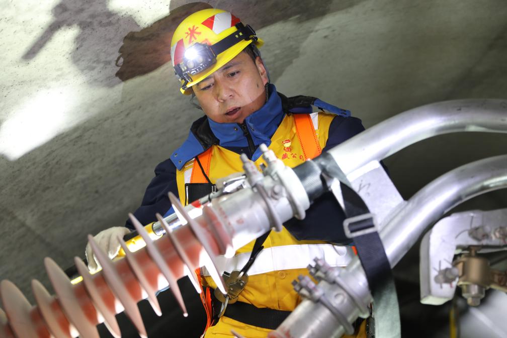 春運期間,接觸網(wǎng)工人劉海軍在拉林鐵路色拉丘隧道內(nèi)為接觸網(wǎng)更換絕緣子。(拉巴次仁攝)