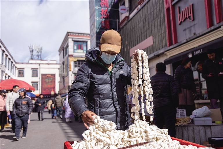 漫步在拉薩的大街小巷,“年的味道”愈發(fā)濃厚,家家戶戶采辦年貨的熱情也日益高漲,呈現(xiàn)出一派紅紅火火的熱鬧景象。那么,你知道藏歷新年的特色年貨都有哪些嗎?“羅薩梅朵”、羊頭、酥油花、“切瑪盒”……這些傳統(tǒng)年貨寓意著新的一年風(fēng)調(diào)雨順、五谷豐登、吉祥如意,是藏歷新年“必不可少”的年貨。2月21日,記者走上街頭,沉浸式體驗(yàn)充滿“煙火氣”的濃濃年味。