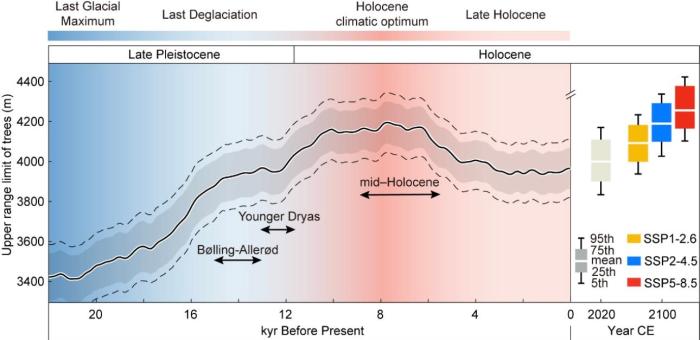 研究結(jié)果顯示,青藏高原平均樹線海拔在末次冰期最低(約3426米);全新世大暖期(距今約8000年)達到最高(約4187米),比當前的平均樹線(約4009米)高約180米。冰期與間冰期樹線波動幅度高達850米,導(dǎo)致間冰期高山特有物種棲息地面積僅為冰盛期的約50%。