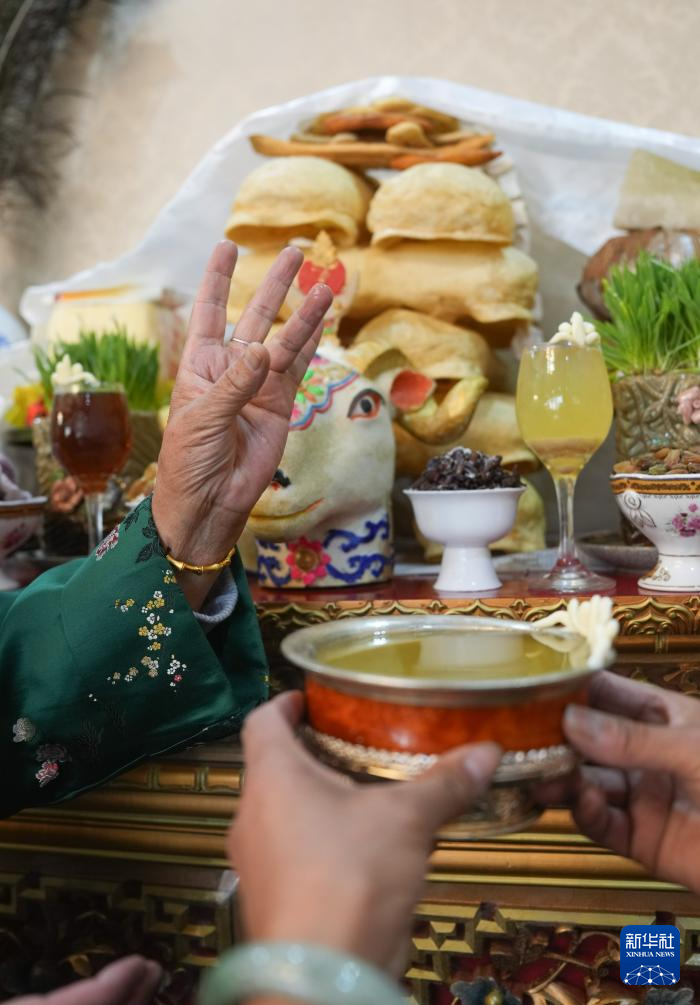 2月28日,身著藏裝的拉薩市民在敬獻青稞酒。