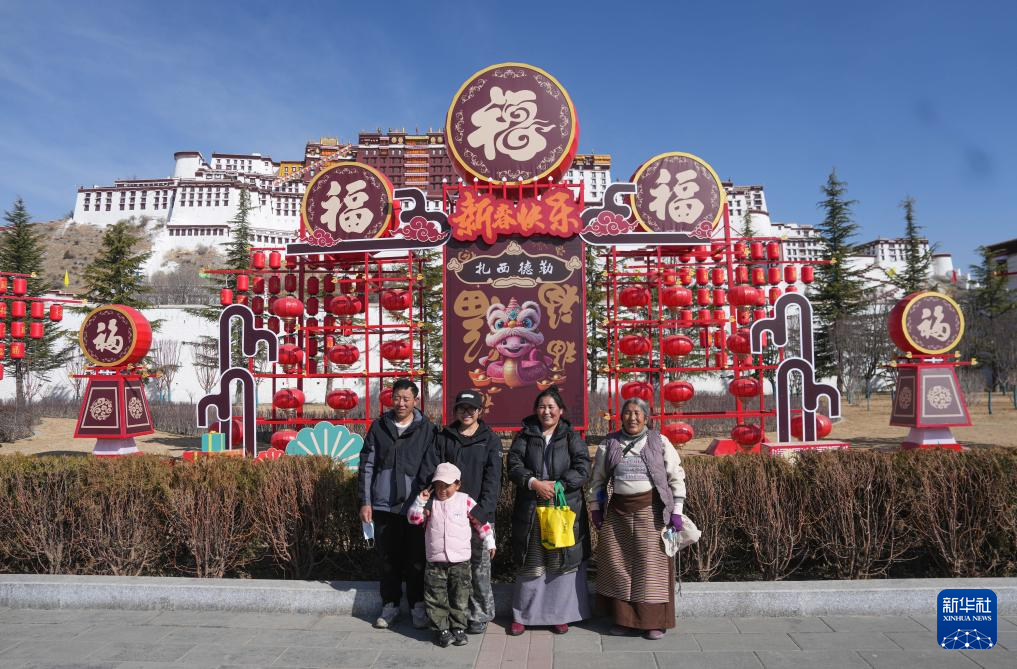 2月28日,來自西藏那曲市比如縣的一家人在拉薩布達(dá)拉宮前合影留念。新華社記者 晉美多吉 攝