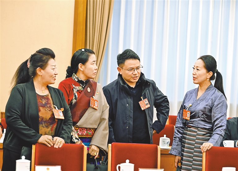 全國人大代表在會議間隙交流審議內(nèi)容。