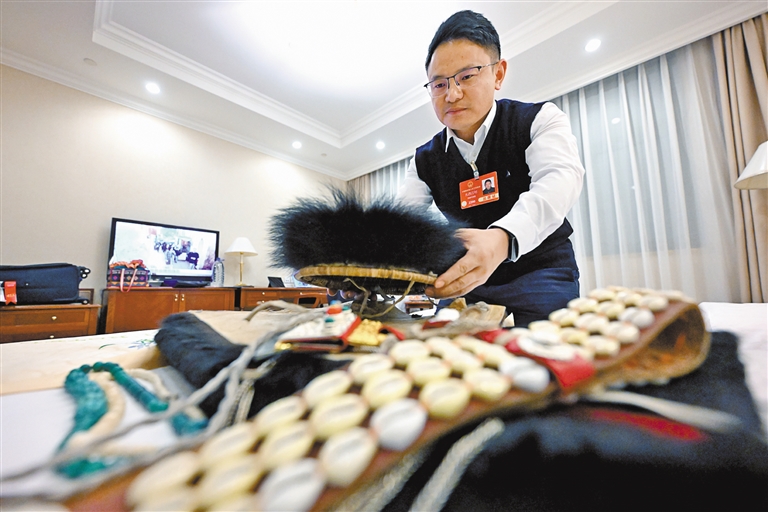 全國人大代表扎西江村在準備參會時穿的民族服飾。