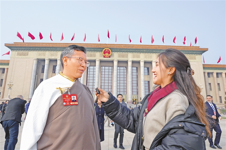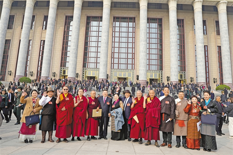 圖為住藏全國(guó)政協(xié)委員等參會(huì)人員在人民大會(huì)堂前合影留念。記者 旦增平措 次旦央吉 攝