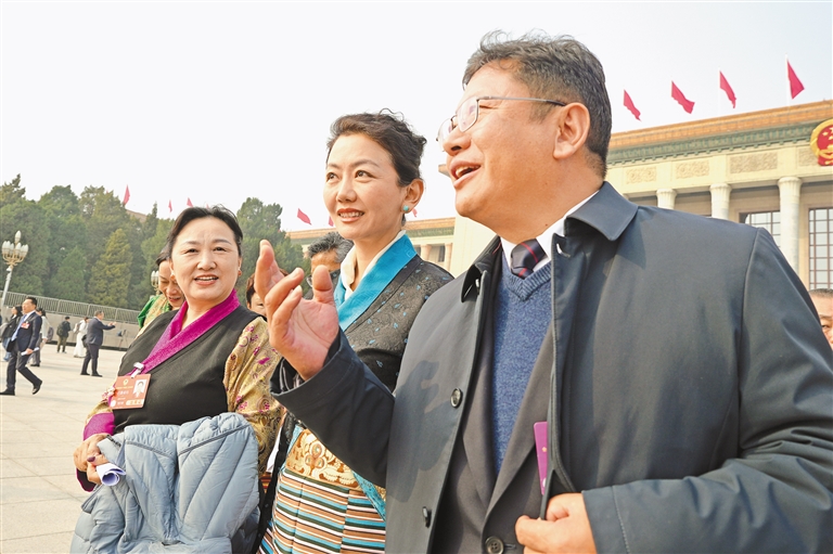 圖為住藏全國(guó)政協(xié)委員白瑪玉珍(中)在“委員通道”上介紹墨脫的發(fā)展變化。記者 旦增平措 次旦央吉 攝