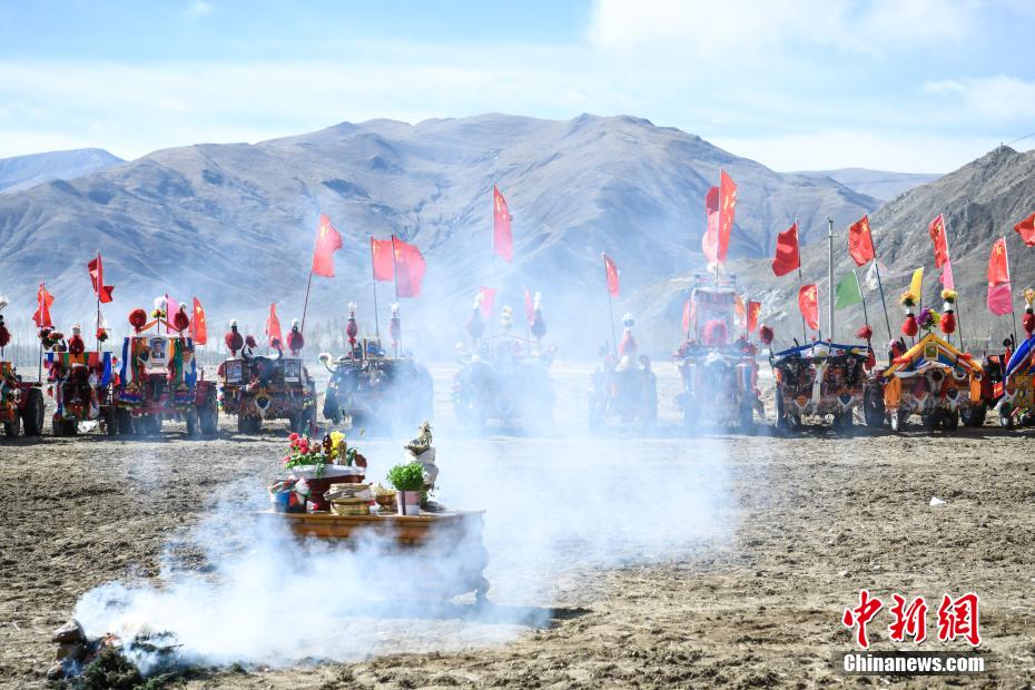 3月16日,西藏拉薩迎來一年一度的傳統(tǒng)春耕儀式。當(dāng)日,拉薩市曲水縣色達(dá)村村民身著節(jié)日盛裝,相聚在田間,載歌載舞,共同迎接春耕第一犁。家家戶戶端著自家的“切瑪”(象征五谷豐登)帶著青稞酒、酥油茶等物品聚在田間,互敬青稞酒,開始撒種,祈求全年風(fēng)調(diào)雨順、五谷豐登。圖為曲水縣色達(dá)村春耕儀式現(xiàn)場(chǎng),當(dāng)?shù)孛癖姳硌菸璧浮栋⒓诎汀贰?span>中新社記者 貢嘎來松 攝
