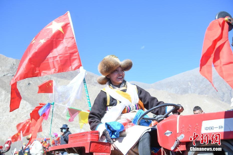 3月16日,西藏拉薩迎來一年一度的傳統(tǒng)春耕儀式。當(dāng)日,拉薩市曲水縣色達(dá)村村民身著節(jié)日盛裝,相聚在田間,載歌載舞,共同迎接春耕第一犁。家家戶戶端著自家的“切瑪”(象征五谷豐登)帶著青稞酒、酥油茶等物品聚在田間,互敬青稞酒,開始撒種,祈求全年風(fēng)調(diào)雨順、五谷豐登。圖為曲水縣色達(dá)村春耕儀式現(xiàn)場(chǎng),當(dāng)?shù)孛癖姳硌輫壹?jí)非物質(zhì)文化遺產(chǎn)《吉祥仲孜》。中新社記者 貢嘎來松 攝