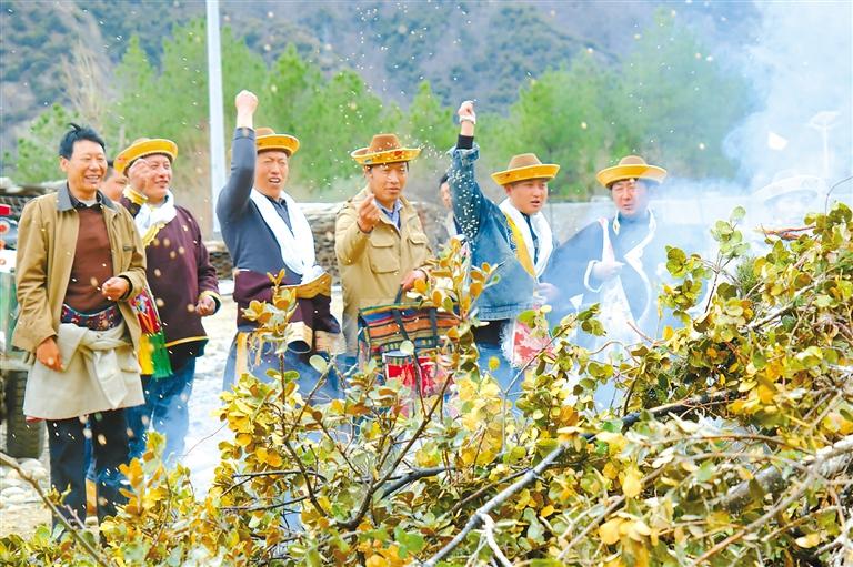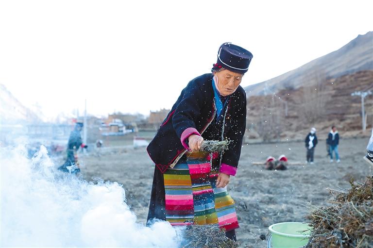 林芝市工布江達縣工布江達鎮(zhèn)阿沛村村民手捏糌粑撒向點燃的青岡樹堆,祈求風調(diào)雨順。記者 謝筱純 攝