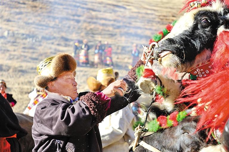 山南市瓊結縣拉玉鄉(xiāng)村民給耕牛喂青稞酒。通訊員 米瑪央金 倫珠澤仁 攝