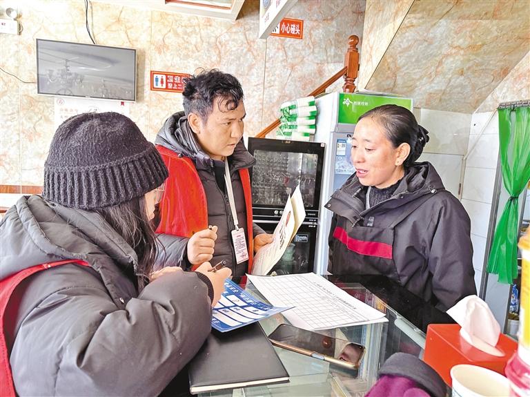 拉薩市城關(guān)區(qū)八一街道當(dāng)熱社區(qū)組織開展食品安全隱患排查工作。這是工作人員在仔細(xì)檢查商戶營業(yè)執(zhí)照、食品衛(wèi)生許可證和健康證等持證情況。記者 王敏 攝
