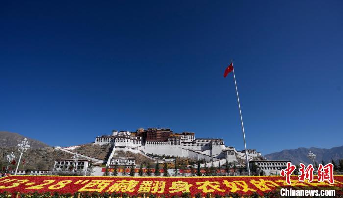 圖為3月28日,西藏布達拉宮廣場擺放西藏百萬農(nóng)奴解放紀念日標語。李林 攝