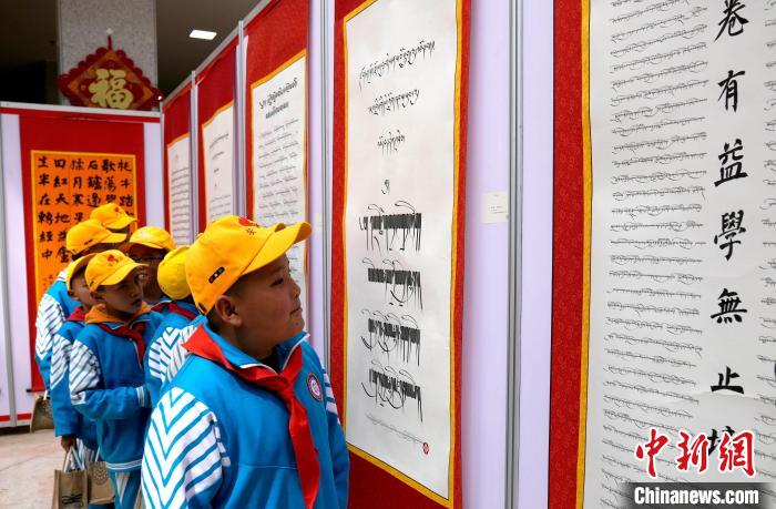 圖為小學(xué)生在圖書館大廳,參觀“傳承與創(chuàng)意”第五屆書法作品展。李林 攝