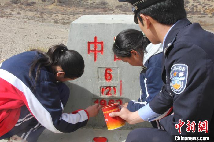 圖為在阿里地區(qū)普蘭邊境一線,學(xué)生與移民管理警察描紅界碑。靜瀾 攝