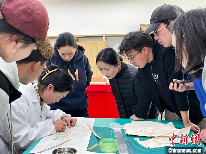 4月22日,西藏大學(xué)圖書館特藏部老師德吉曲珍為學(xué)生上古籍修復(fù)課程,所使用的為仿真古籍。中新社記者 趙朗 攝