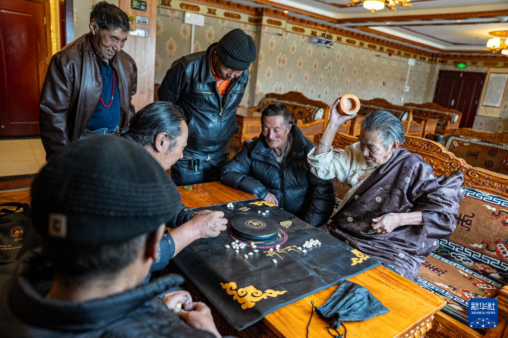 4月25日,老人們?cè)谀乔猩釁^(qū)老年人日間照料中心玩藏式骰子。新華社記者 丁增尼達(dá) 攝