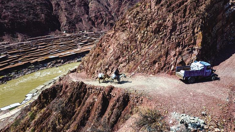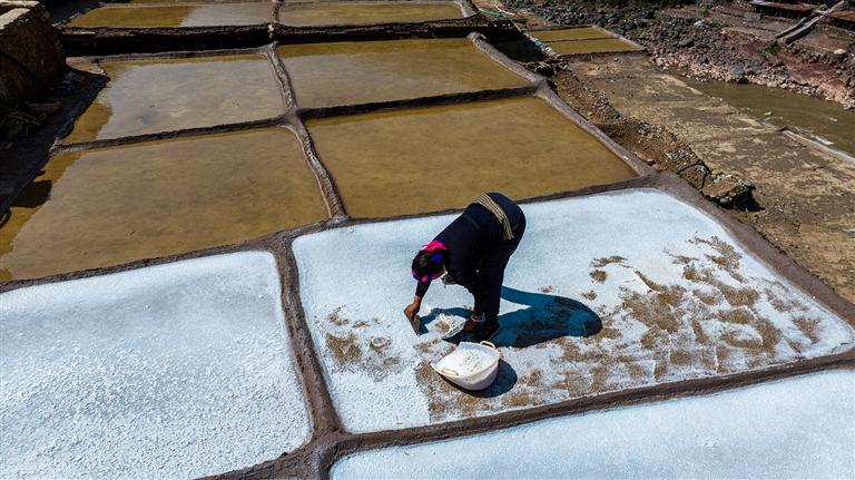 鹽田上,60歲的乃柯正和丈夫一起用木拍夯實(shí)鹽田?!艾F(xiàn)在用泵抽水輕松多了,但拍鹽田的手藝不能丟?!崩先说脑捳Z中,既有對(duì)科技的接納,也有對(duì)傳統(tǒng)的堅(jiān)守。鹽田下方,鹽晶垂落成簾,在山風(fēng)拂動(dòng)下閃爍微光,仿佛在訴說著千年文明的厚重。
