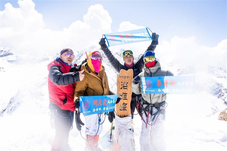 當部分山友抵達洛堆峰一處近60度坡度冰面時,太陽緩緩升起,金色的陽光照射在山友們身上,寒冷、缺氧時刻考驗著每一個人,但大家邁著堅定的步伐繼續(xù)攀登。經(jīng)過數(shù)小時的攀登,來自西藏民族大學體育學院的3名學生,最先沖頂成功。隨后,陸續(xù)有山友安全挺進洛堆峰海拔6010紀念碑處。大家共同見證了雪山之巔的壯麗風景。