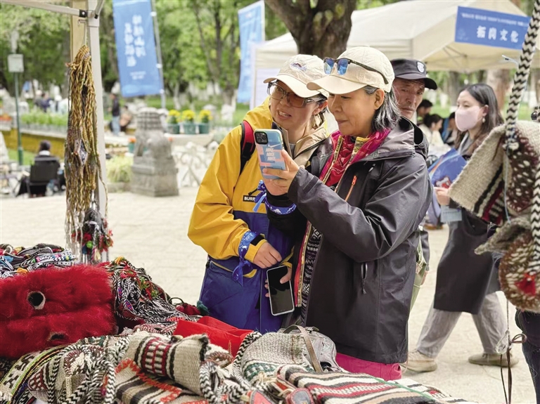 在西藏“非遺”文化體驗(yàn)區(qū),來自湖南的游客張麗一邊挑選包包一邊感嘆:“哇噻,真的太神奇了!沒想到牦牛毛還可以做成這么漂亮的包包,我要多買幾個帶回去給朋友。還能把這份獨(dú)特的文化記憶帶回家。”