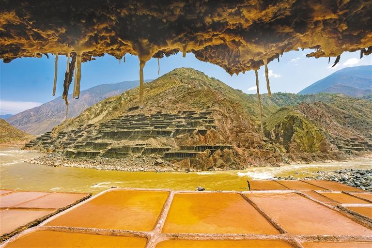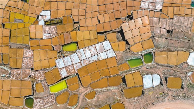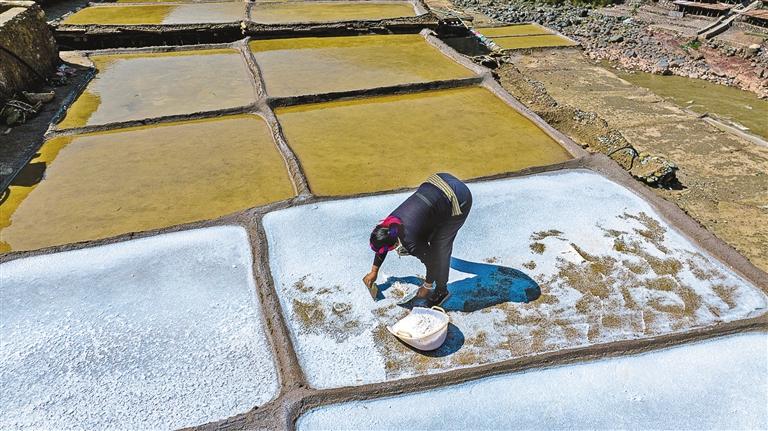 鹽田里,60歲的乃柯正和丈夫一起用木拍夯實鹽田?!艾F(xiàn)在用泵抽水輕松多了,但拍鹽田的手藝不能丟?!崩先说脑捳Z中,既有對科技的接納,也有對傳統(tǒng)的堅守。鹽田下方,鹽晶垂落成簾,在山風(fēng)拂動下閃爍微光,仿佛在訴說著什么。一塊塊鹽田如同一面面鏡子,既映照出千年文明的厚重,也折射著鄉(xiāng)村振興的希望。當(dāng)鹽民們輕掃鹽田,他們掃的不僅是晶瑩的鹽,更是一份在傳承與創(chuàng)新中守護的鄉(xiāng)愁。