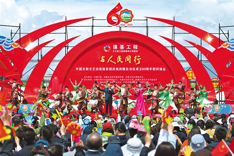 上午10時(shí)整,“與人民同行”中國文聯(lián)文藝志愿服務(wù)團(tuán)慶祝西藏自治區(qū)成立60周年慰問演出,在歌舞《鼓舞西藏》的熱烈氛圍中正式開場。