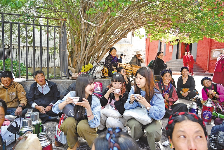 日本游客與當(dāng)?shù)厝罕娨黄鹌穱L青稞酒。