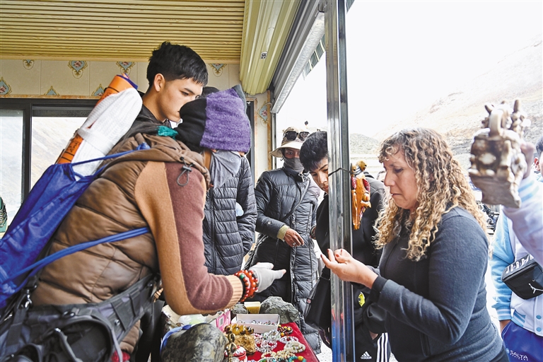 新奇感過后,游客們開啟購物模式?!鞍⒓?,這個掛飾可以定制嗎?”“你們可以發(fā)快遞嗎?”對于一連串的問題,阿佳格桑忙碌地一一回答著,“你們想要什么圖形,我們就給你定制什么圖形?!薄拔覀冞@兒快遞很快,今天下單明天就給你發(fā)!”短短半個小時,“阿佳格桑工坊”的生意火爆,銷售藏式靠墊、藏式地毯、掛飾等特色產(chǎn)品4000多元?!盎厝ズ?,我要通過自媒體平臺,宣傳這次西藏之旅的所見所聞,讓更多親朋好友來西藏旅游!”日本游客琴音有感而發(fā)。
